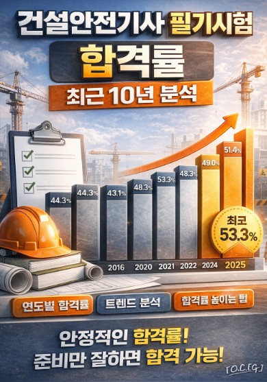 건설안전기사 필기시험은 최근 10년간 대체로 안정적이고 예측 가능한 합격률을 유지해 왔습니다. 합격률만 보면 초보 수험생도 충분히 체계적인 준비로 합격 가능한 시험입니다.