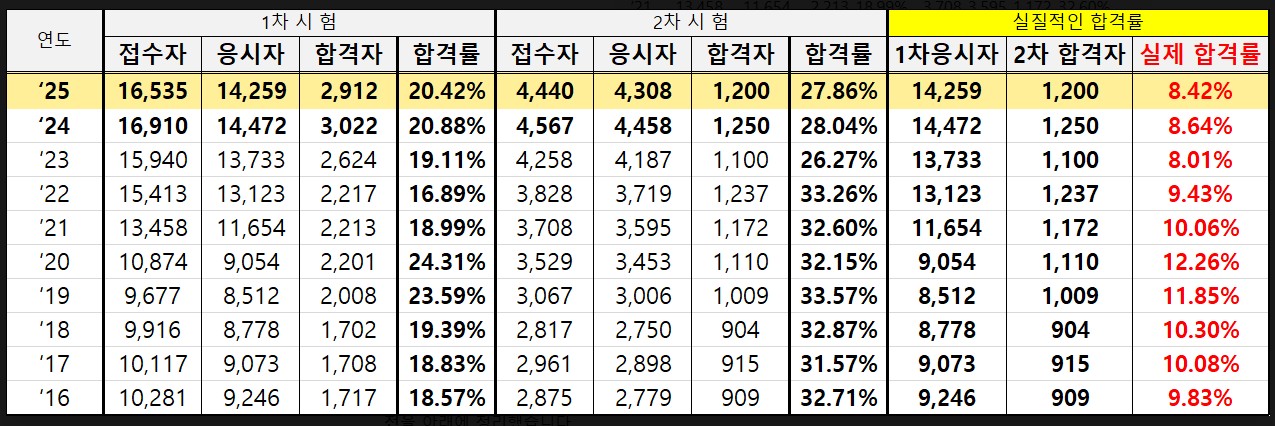 즉, 1차에 합격하더라도 2차에서 다시 대규모 탈락이 발생하며, 실제로 수험생이 체감하는 합격 가능성은 공식 합격률보다 훨씬 낮다.