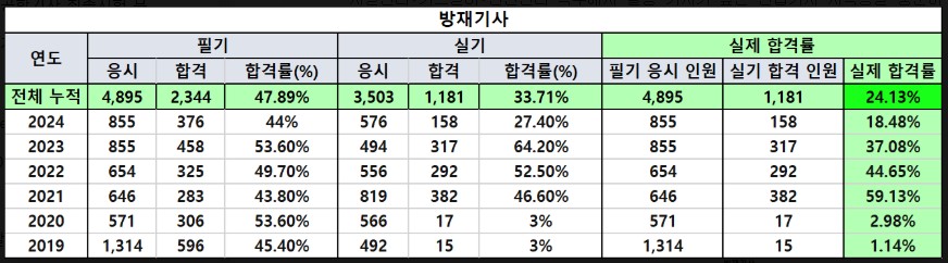 이번 포스팅도 방재기사 최근 합격률 데이터(2019~2024)를 바탕으로 필기·실기·실제 합격률 흐름과 합격 전략을 정리했습니다.