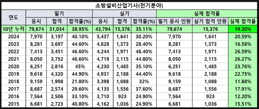 이 시험은 과목 난이도나 후기만 보고 판단하기보다는, 합격률 데이터를 기반으로 객관적으로 접근하는 것이 가장 안정적입니다. 오늘 포스팅에서도 최근 10년(2015~2024) 소방설비산업기사(전기분야) 필기 합격률·실기 합격률·실제 합격률 자료를 바탕으로 시험 난이도와 합격 전략을 정리해보겠습니다. (합격률 표는 제일 하단에 이미지로 첨부 했습니다.)