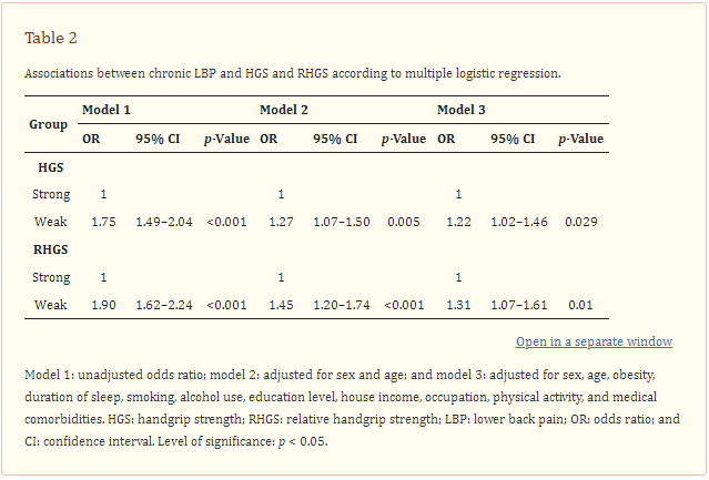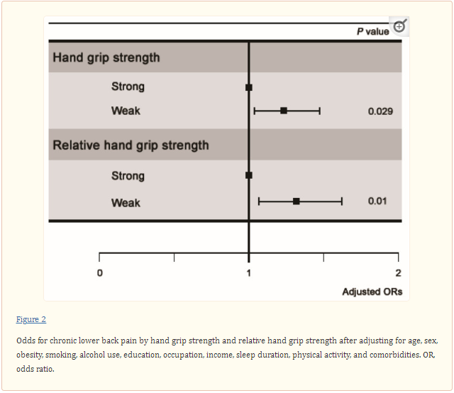 [Choi S, Nah S, Jang H, Moon J, Han S. Association between Relative Handgrip Strength and Chronic Lower Back Pain: A Nationwide Cross-Sectional Analysis of the Korea National Health and Nutrition Examination Survey. Int J Environ Res Public Health. 2021 Oct 14;18(20):10770. doi: 10.3390/ijerph182010770. PMID: 34682530; PMCID: PMC8535507]