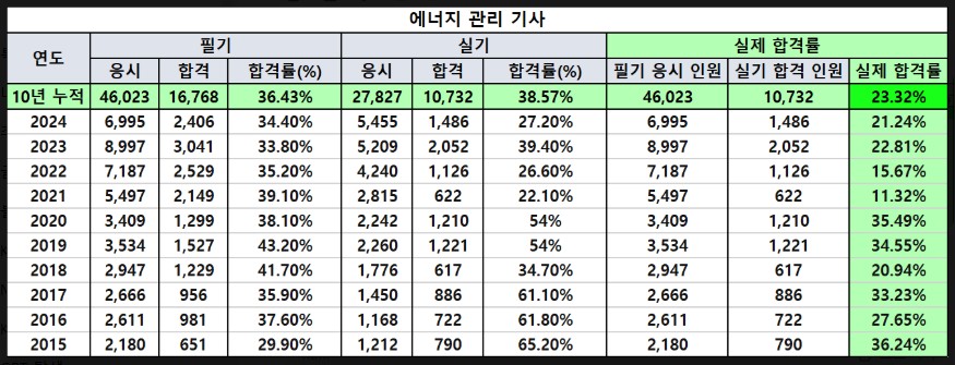 이번 포스팅에서도 최근 10년(2015~2024) 에너지관리기사 필기 합격률·실기 합격률·실제 합격률(최종) 데이터를 바탕으로 시험 난이도 흐름과 합격 전략을 정리해보겠습니다. (합격률 표는 본문 하단에 이미지로 첨부 했습니다.)
