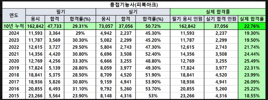 이번 포스팅에서도 최근 10년(2015~2024) 용접기능사(피복아크) 필기 합격률·실기 합격률·실제 합격률 자료를 바탕으로 시험 난이도 흐름과 합격 전략을 정리해 보았습니다. (합격률 표는 본문 제일 하단에 이미지로 첨부했습니다.)