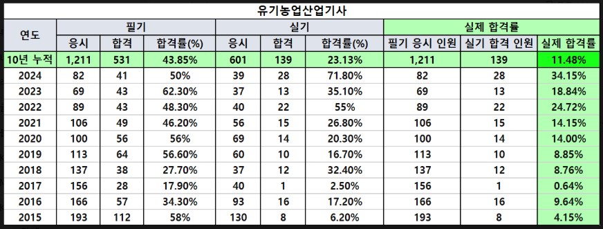 이번 포스팅에서도 최근 10년(2015~2024) 유기농업산업기사 필기 합격률·실기 합격률·실제 합격률 데이터를 바탕으로 시험 난이도 흐름과 합격 전략을 정리해보았습니다. (합격률 표는 이미지로 첨부 했습니다.)